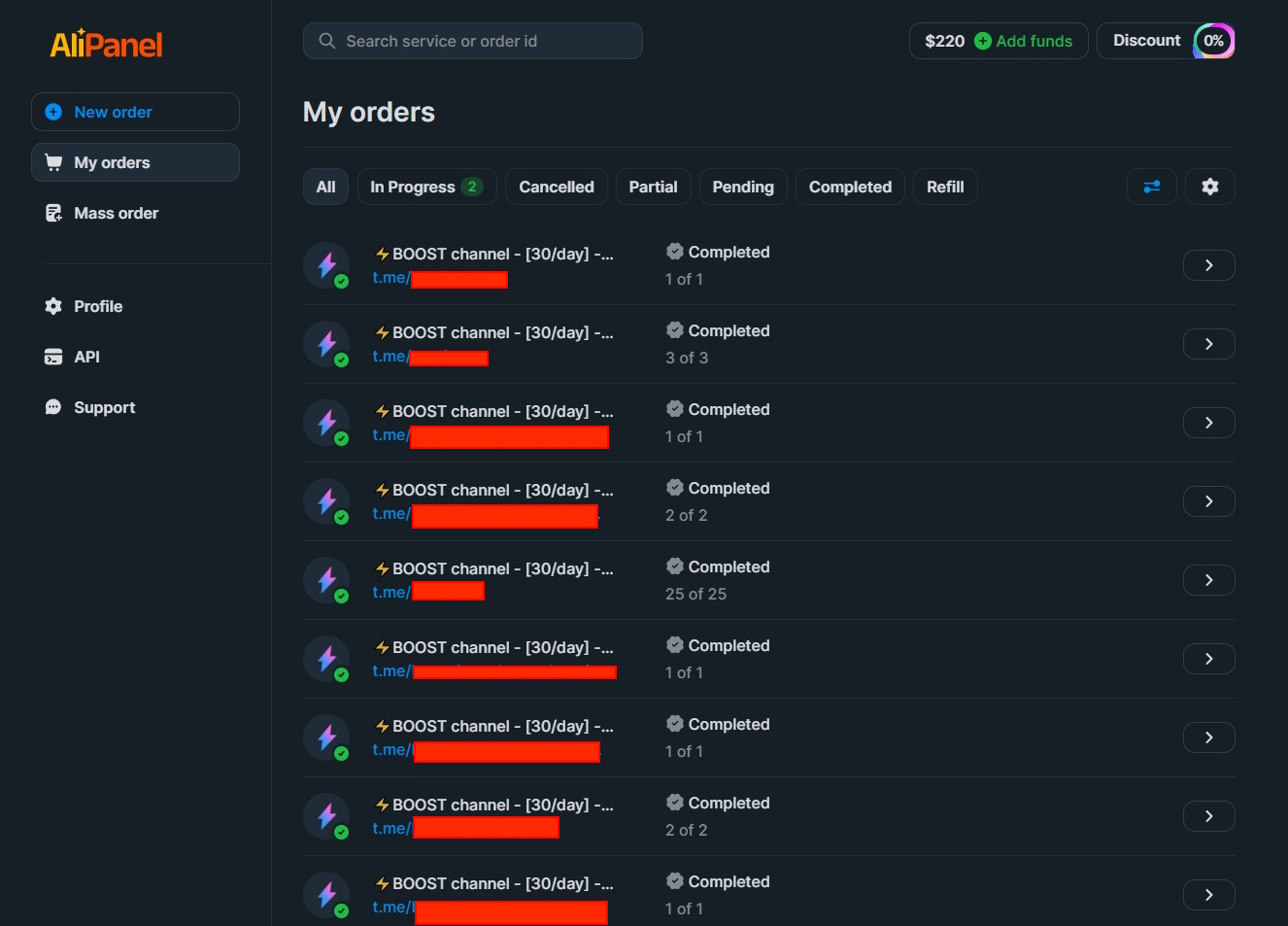 Alipanel - это надежный прямой провайдер, предоставляющий премиум-услуги для роста социальных медиа, в частности для Telegram и VK. Компания предлагает широкий спектр услуг, включая премиум-подписчиков, быстрые старты ботов, просмотры и другие решения для увеличения присутствия и вовлеченности в социальных сетях. Благодаря прямому предоставлению услуг, Alipanel гарантирует высокое качество и надежность, а также конкурентоспособные цены на рынке. Команда поддержки доступна 24/7 для помощи клиентам.