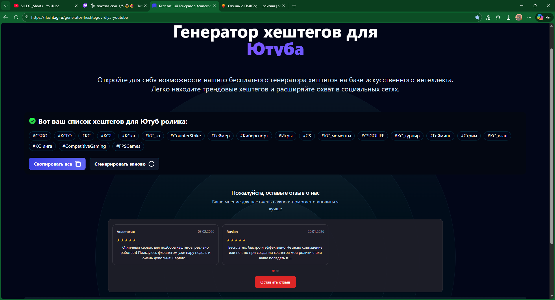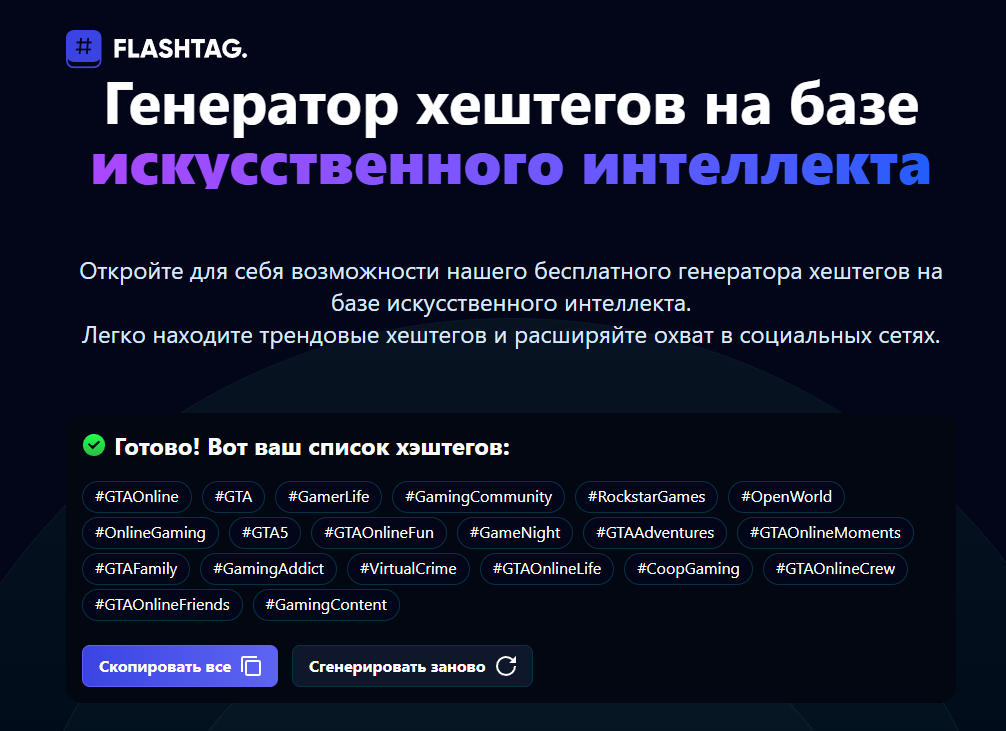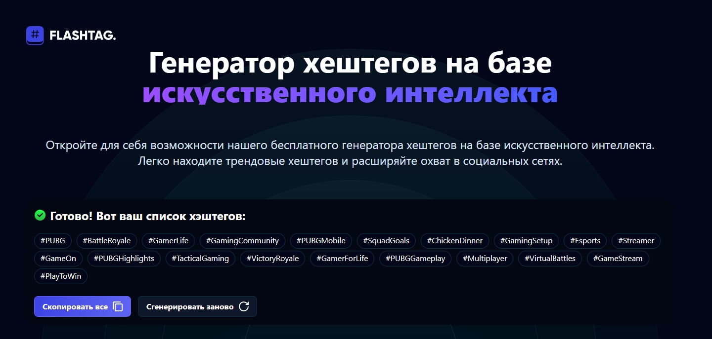 FlashTag - это сервис, предлагающий бесплатный генератор хештегов на основе искусственного интеллекта. Сервис помогает пользователям легко находить трендовые хештеги и расширять охват в социальных сетях. Искусственный интеллект анализирует последние рекомендации и подбирает хэштеги с наибольшей вероятностью попадания в рекомендации.